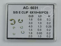 Box of 60 assorted circlips in 6 sizes (diameters 1.5mm, 1.6mm, 1.8mm, 2mm, 3mm, 4mm).