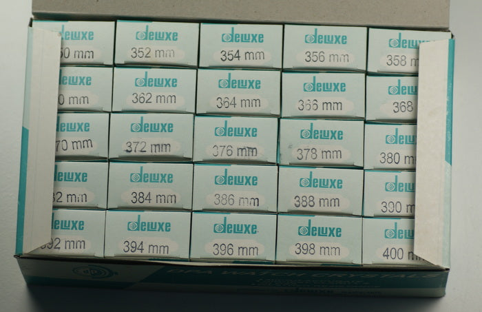 The sizes are 35mm, 35.2mm, 35.4mm, 35.6mm, 35.8mm, 36mm, 36.2mm, 36.4mm, 36.6mm, 36.8mm, 37mm, 37.2mm, 37.6mm, 37.8mm, 38mm, 38.2mm, 38.4mm, 38.6mm, 38.8mm, 39mm, 39.2mm, 39.4mm, 39.6mm, 39.8mm, 40mm. (note the box does not contain 37.4mm).