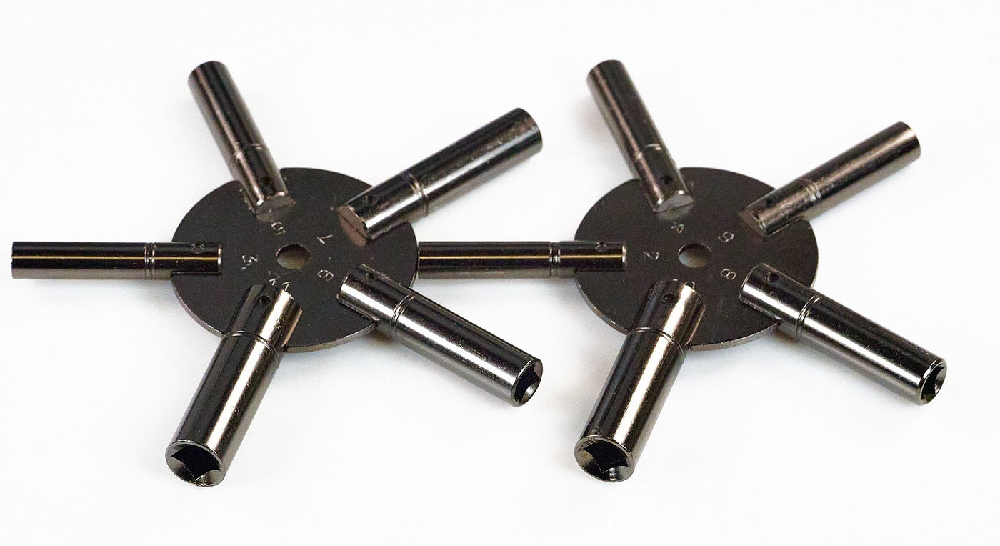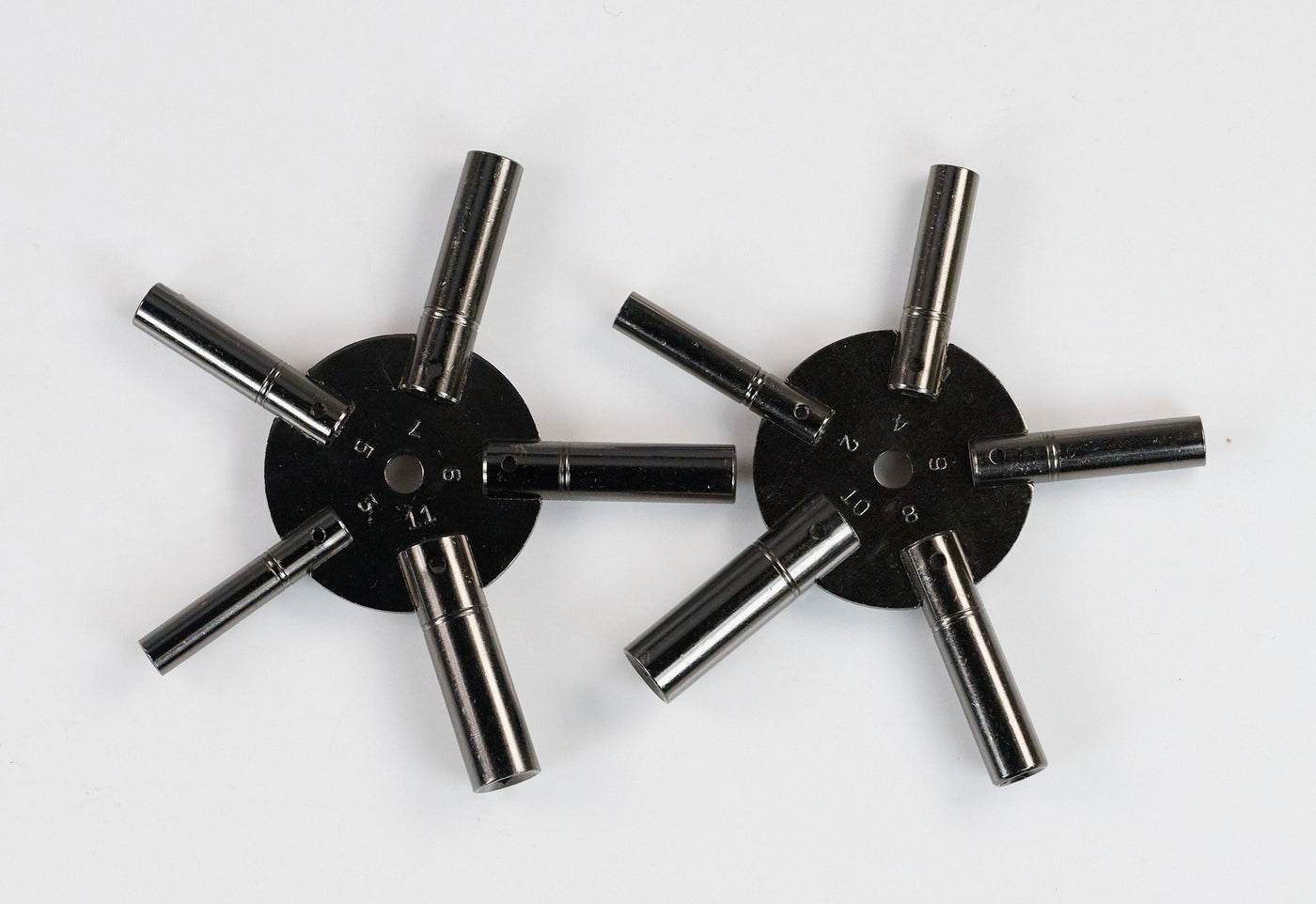 High quality black or gun metal colour spider keys. ALL SIZES clock keys or winders, 10 sizes on 2 keys.