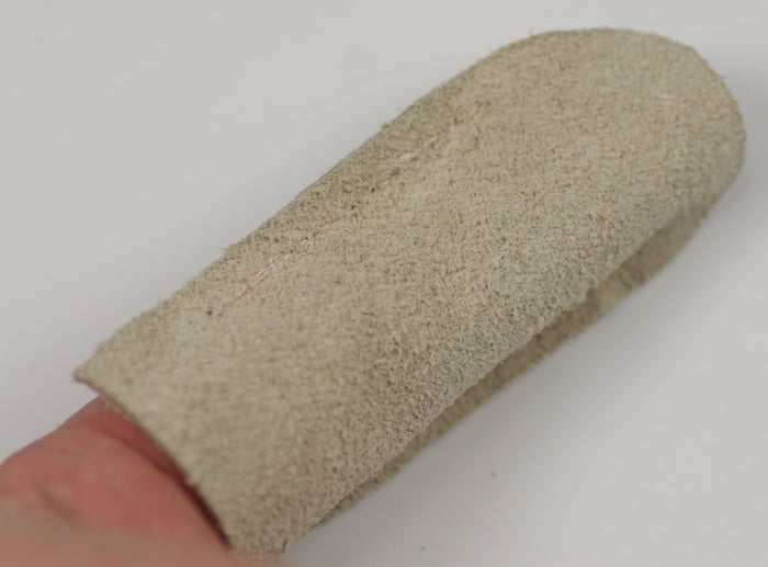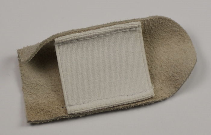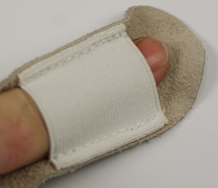 Leather finger guard with open finger end, elastic allows finger to bend normally. Great little protectors for fingers. We also sell these with closed finger ends.